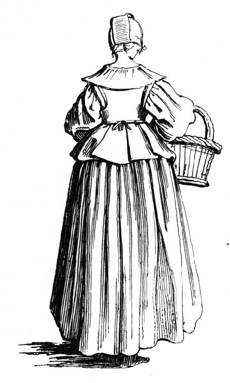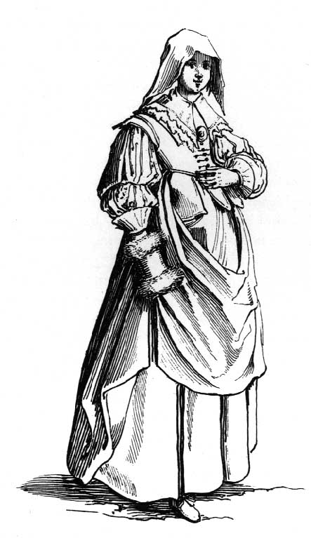 Country wife wearing linen coif, straw or felt hat, apron, jacket,
