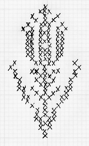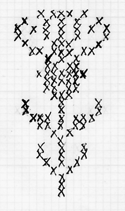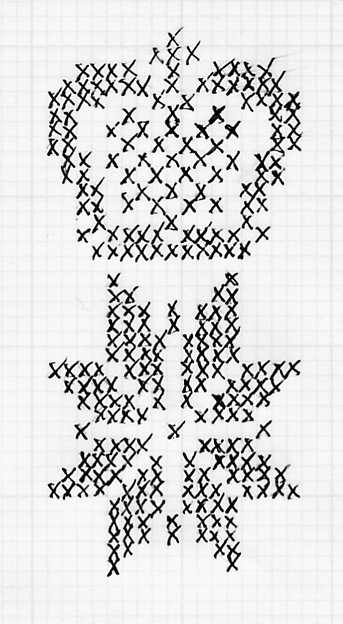 Back 'Seam': Cut-and-sewn hose (which don't fit as closely as knitted stockings) were still worn by some in the lower classes into the early 19th century, at which point machine-knitted stockings became cheap enough that cut-and-sewn hose were displaced. Styles: Gussets and Clocks: On common stockings, the heel-flap-and-gusset style shown here seems to be fairly common. This gives you a short gusset to the ankle; the longer gussets seen in some 18th c. artwork may be a feature of machine-knitted stockings. Purl-stitch clocks (Gunnister stockings, Pulliam p. 31) and embroidered clocks were used; a common method was called "plating", in which the design was added using an additional color knitted into the fabric of the stocking. This can be imitated by embroidering the stockings with a duplicate stitch following the shape of the knit stitches.. A rose-and-crown motif was one of the more common designs. When the gore is a different color from the rest of the stocking, the embroidered clocks usually match the color of the gore. Some surviving silk stockings also have clocks embroidered in gold or silver thread. Clock designs from "Neues Nah und Strictbuch fur das schone Geschlecht" (New Needlework and Knitting Book for the fair sex), 1784. See Farrell, p. 38, for these and other designs.